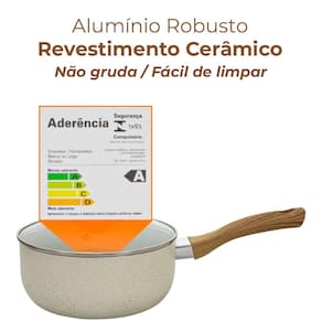 A Panela é produzida em alumínio na cor vanilla com revestimento cerâmico marble e classificação A do Inmetro, não gruda, é mais fácil de limpar e mais saudável, pois necessita de menos óleo para o cozimento e é livre de metais pesados.