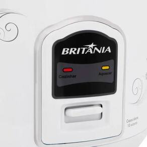 Panela de Arroz Britânia Prime com capacidade para 10 xícaras de arroz cru, sistema de aquecimento automático, bandeja para cozinhar a vapor, tigela antiaderente, acompanha colher e copo medidor.Lâmpada piloto