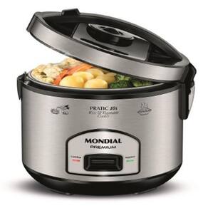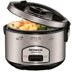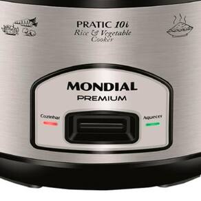 Panela Arroz Mondial Pe-42-10X - 4152-02Panela elétrica de arrozVálvula de saída de vapor:Libera o excesso de vapor durante o preparo, proporcionando o cozimento perfeito.Revestimento antiaderente:Facilita a limpeza e evita que o alimento grude no interior do produto.Alça:Facilita o transporte.Tampa basculante com travamento:Permite a utilização prática e segura.Coletor de vapor:Recolhe a água condensada durante o funcionamento do produto.Função aquecer:Mantém o alimento aquecido por até 8 horas.Acessórios:Acompanha colher e copo medidor.Lâmpada-piloto:Indica o funcionamento da panela.Informações técnicasVoltagem/frequencia: 127v/60hz / 220v/60hzDimensõesAltura:28,6 cmLargura:28,20 cm Profundidade: 28,20 cmPeso: 2.73 kg