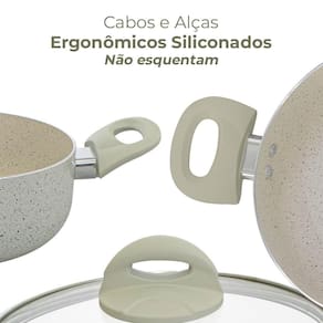 Possui cabos e alças com acabamento siliconado Soft-Touch da mesma cor da panela, que dão um toque macio e não esquentam, evitando acidentes.