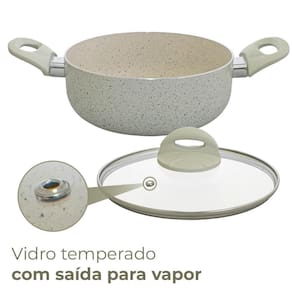 É produzida em alumínio na cor vanilla com revestimento cerâmico marble classificação A do Inmetro, não gruda, é mais fácil de limpar e mais saudável, pois necessita de menos óleo para o cozimento e é livre de metais pesados.