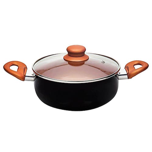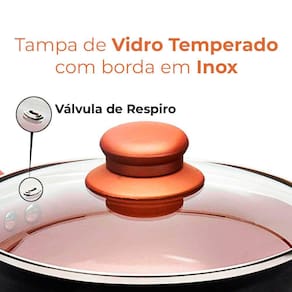 A panela caçarola 22cm da linha Vegas Casambiente é feita em alumínio com revestimento cerâmico que dispersa melhor o calor e irá te garantir um cozimento com maior agilidade. A panela é na cor preta com revestimento e cabos na cor bronze, possui tampa de vidro temperado com válvula de escape para o vapor e borda em inox, também possui alças em baquelite com revestimento de silicone, o que evita com que superaqueça e cause um acidente.