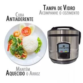 Características Gerais do produto Panela de arroz elétrica de inox cometros capacidade para 10 xícaras de arroz cru, sistemetrosa de aquecimetrosento autometrosático, recipiente interno antiaderente.