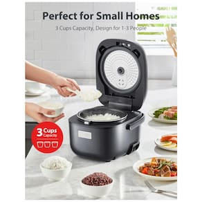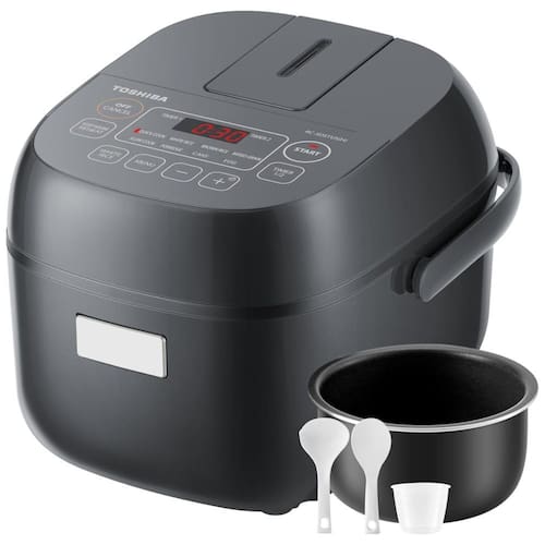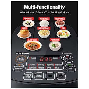 Esta panela de arroz pequena e multifuncional possui uma tela LCD e 8 funções de cozimento programáveis, incluindo arroz branco, cozimento rápido, arroz integral, grãos mistos, lento cozinheiro, mingau, bolo e ovo. É perfeita para famílias ou indivíduos que desejam cozinhar várias porções de arroz de diferentes tipos, como arroz integral, arroz de jasmim, arroz de sushi, arroz branco, arroz basmati e arroz selvagem, bem como grãos como aveia, quinoa, grãos mistos e muito mais. A panela elétrica de arroz TOSHIBA é inteligente e detecta a umidade do arroz, ajustando a temperatura e o tempo de cozimento de acordo, resultando sempre em arroz fofo e perfeitamente cozido. Além disso, a panela interna ultra grossa de 3MM é mais resistente ao desgaste e infundida com material de carbono Binchotan para ajudar a concentrar o calor durante o cozimento, garantindo que o arroz fique mais fofo. O painel de controle intuitivo possui um grande display LCD para programação rápida e sem esforço, e a função Keep Warm Reheat mantém seu arroz quente e delicioso por horas. Os acessórios incluídos são um copo medidor, espátula e concha de sopa.