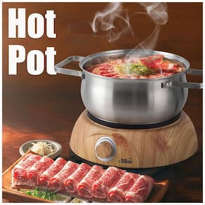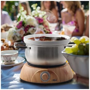 Panela externa de aço inoxidável de design elegante, panela interna de cerâmica removível e 8 garfos de fondue com alças resistentes ao calor em várias extremidades de cores Pote de aço inox 2500ml, pote de cerâmica removível de 1000ml, tamanho perfeito para servir uma família Possui um controle de calor rotativo, gira para a temperatura perfeita para derreter queijo ou receita de chocolate Ele usa eletricidade padrão da América do Norte, 120 V 60 Hz, certificado ETL Conjunto de Fondue de Chocolate e Queijo em Aço Inoxidável da Artestia. Número do modelo AR 89008 Marca: Não Informado