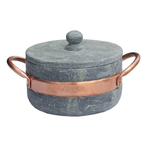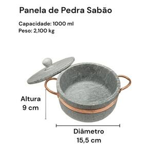 Panela de Pedra Sabão com tampa de pedra e alça de cobre.Que tal reunir a família e amigos para compartilhar bons momentos acompanhados de deliciosas receitas!?As panelas de Pedra Sabão deixarão suas receitas ainda mais gostosas. Elas propagam o calor de forma uniforme e eficiente, cozinhando o alimento por igual e os mantem quente por mais tempo, mesmo após retirar do fogo.Duráveis e decorativas as panelas de Pedra Sabão levam charme e requinte para sua cozinha e mesa. Leve o sabor da comida mineira para sua casa!Medidas Panela 1000 ml: