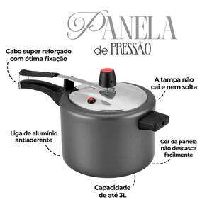 Cores: cinza, cereja ou inox Capacidade: 3 litros; Válvula de segurança certificada pelo inmetro; Cabos e alças resistentes.