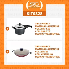 Componentes do kit:- 1 panela 4,5 vancouver grafite - tramontina- 1 panela wok 36cm - tramontina- não indicado para fogão indução.Panela 4,5 vancouver - tramontinadescrição ficha técnica:modelo vancouver starfloncód. 20582/620 grafitecód. 20582/720 vermelha eficiente e segura.Produzida em alumínio com revestimento interno e externo em antiaderente starflon t1tampa em aluminio com acabamento externo polido e interno satinado tampa não é antiaderente .Alças e cabo superior e inferior em baquelite.Sitema de segurança lateral.Válvula de segurança.Válvula de trabalho alívio .- revestimento antiaderente starflon.- maior resistência á desgaste por fricção, raspagem.- pode cozinhar fogão gás, elétrico e também vitrocerâmico.- fácil manuseio e limpeza.- capacidade 4,5l.- 1 unidade por embalagem.- 3 sistema de segurança 1 cabo e 2 na tampa peso líquido: 1,6 kgpeso bruto: 1,75 kgmedidas internas panela : 19,5cm diâmetro x 14,5 alt. verifique o nivel máxima informado no interior panela medida externa: 22,9cm a x 40,8cm l x 23,1 p - mais detalhes, na foto do anuncio .Panela 36cm wok paris aluminio antiaderente tramontina 20545/736 descrição ficha técnica:produzida em alumínio com revestimento interno em antiaderente starflon t1tampa em vidro tamperado com saída de vapor e borda de aço inóx.Alças em aço inox com proteção de baquelite antitérmico e pagador de nylon.- modelo wok paris 36cm.- corpo em aluminio reforçado.1,8mm. - revestimento antiaderente starflon.- maior resistência á desgaste por fricção, raspagem.- pode cozinhar fogão gás, elétrico e também vitrocerâmico.- fácil manuseio e limpeza.- capacidade 6 l.- 1 unidade por embalagem.- pode lavar em máquina.Peso líquido: 1,8 kgpeso bruto: 1,95 kgmedida externa: 15,5cm a x 46,4cm l 36,4cm área cuba . - mais detalhes, na foto do anúncio .Expecificação da embalagem do kit:peso bruto: 3,7kg medida embalagem: 32 cm alt x 39cm l x 38cm p.Perguntas frequentes:- produto novoSim, , lacrado e de fábrica.- qual a garantiaGarantia é de 12 meses contra defeito de fábricação.- quantos litrosPanela 36cm wok capacidade 6l.Modelo vancouver starflon capacidade 4,5l.