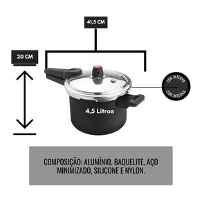 Fabricada em alumínio, ela possui revestimento interno antiaderente, 4,5L de capacidade, fechamento externo, alça e cabo antitérmico. E para maior segurança, a tampa tem válvula e trava de segurança. Com ela você cozinha feijão, lentilha, grão-de-bico, além de carnes, aves, peixes e o que mais desejar.