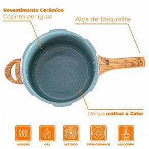 A panela de pressão Ceramiclife Botanika conta com estrutura de alumínio com revestimento cerâmico que cozinha os alimentos por igual e mais rápido, dissipando melhor o calor, proporcionando um maior aproveitamento de nutrientes dos alimentos. Agora com exclusivo fundo de indução, que funciona em todos os tipos de fogões à gás, elétrico, vitrocêramico e os de indução, para você passar menos tempo cozinhando e ter mais segurança durante os preparos. Além disso, suas paredes externas possuem pintura na cor verde trazendo mais leveza para a sua cozinha. Seu cabo e alça de baquelite com revestimento soft touch proporcionam mais conforto e melhor manuseio. Possui 2 anos de garantia e 4 dispositivos de segurança (uma trava, duas válvulas de trabalho e um escape de segurança).