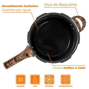Seu cabo e alça são feitos em baquelite soft-touch com design amadeirado, dando um toque macio e proporcionando mais segurança, conforto e melhor manuseio, pois não esquentam.