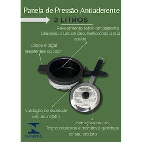 Panela de Pressão Antiaderente Teflon Alumínio Imperial 2L Preto Com a panela de pressão antiaderente da Alumínio Imperial você também adquire praticidade e segurança para você e sua família. Seus componentes passam por testes rigorosos e o produto acompanha selo de qualidade INMETRO. Benefícios: - A borracha altamente resistente impede que o ar escape e faça com que a panela perca a pressão interna. - A válvula impede que o limite de pressão seja excedido. - Possui trava de segurança. - Alumínio Informações Técnicas: - Litragem: 2,0L. Marca: Alumínio Imperial