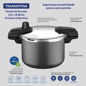 Panela de Pressão Arizona Indução 20 cm 4,5 L em Alumínio Revestimento Interno e Externo Grafite Tramontina - Especificações TécnicasDimensões Produto (Compr. X Larg. X Alt.): 23,9 x 22,9 x 18,7 cm.