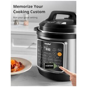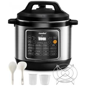 A Panela de Pressão COMFEE de 8 litros oferece 16 funções programáveis que atendem a todas as suas necessidades culinárias. Cozinhe pratos gourmet como carne, caldo, feijão, aveia, e muito mais, de forma prática e rápida. Cozinhe de maneira saudável com a panela revestida de cerâmica, livre de produtos químicos nocivos. O revestimento antiaderente facilita a limpeza e garante durabilidade. Para sua segurança, possui travamento de tampa, proteção contra bloqueio, controle automático de pressão e temperatura, além de proteção contra superaquecimento. Com capacidade para 8 litros ou 20 xícaras de arroz cozido, atende facilmente refeições para 6 a 8 pessoas. Acompanha 6 acessórios úteis: colher, concha, copo medidor, copo de condensação, suporte para cozimento a vapor e cabo de energia.