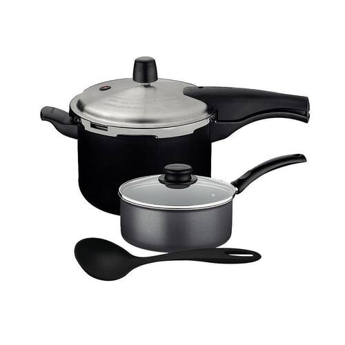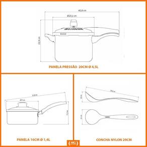 MUITO IMPORTANTE:CONFERIR PRODUTOS NO ATO DO RECEBIMENTO. NÃO ACEITAR PRODUTOS COM EMBALAGEM VIOLADA (AMASSADO, RASGADO, ABERTO, QUEBRADO, ETC), A RECUSA DEVE SER FEITA NO ATO Componentes do Kit:1 - Panela Turim Alumínio Antiaderente Chumbo 16cm 1,4L PTC3 - Tramontina 1 - Panela de Pressão Effect Alumínio Revestimento Antiaderente 20 cm 4,5 l Preto1 - Concha 29cm Ability em Nylon Preto - Tramontina Panela de Pressão Effect 4,5L e Panela Turim Alumínio Antiaderente 1,4L PTC + Concha - Tramontina Aprimore sua performance na cozinha com o Kit de Panelas Tramontina, a dupla perfeita para quem busca agilidade no preparo e pratos com sabor profissional. Esse conjunto é ideal para cozinheiros domésticos, transformando a rotina de preparar refeições em uma tarefa prazerosa e simples. A Panela de Pressão Effect cozinha os alimentos de forma rápida e segura, enquanto a Panela Turim Antiaderente garante que nada grude, facilitando o manuseio dos ingredientes. A capacidade de 4,5L da panela de pressão é ideal para famílias, garantindo resultados deliciosos e em menos tempo. A Panela de Pressão Effect possui um sistema de segurança de cinco válvulas, que garante o cozimento sem riscos. Já a Panela Turim, com seu revestimento antiaderente Starflon T1, proporciona uma superfície de cozimento fácil de limpar e livre de resíduos. Ambas são construídas com alumínio de alta qualidade, oferecendo resistência e durabilidade para anos de uso. Com o fundo de 1,4mm de espessura, o calor é distribuído de forma uniforme, otimizando o tempo de cozimento e economizando energia. Não perca a oportunidade de ter mais eficiência e tranquilidade na sua cozinha. Adquira agora o Kit Tramontina e tenha o poder de criar pratos incríveis com muito mais facilidade! Especificações Panela:- Capacidade: 1,4L;- Alumínio com 1,2mm de espessura;- Revestimento anti-aderente;- Altura com tampa e cabo: 13,9cm;- Altura somente com tampa: 14,4cm;- Altura interna: 6,7cm;- Diâmetro: 16cm;- Comprimento total: 31,9cm;- Garantia de 90 dias para vícios ou defeitos de fabricação;- Não utilizar em temperaturas superiores à 260C. Especificações Panela de Pressão:- Corpo de alumínio com espessura de 3,2 mm que proporciona cozimento rápido e uniforme.- Com revestimento interno e externo de antiaderente Starflon Max que não gruda, é fácil de limpar, mais durável e não é prejudicial à saúde.- Alça, cabos superior e inferior de baquelite antitérmico que oferecem segurança durante o manuseio.- Pode ser utilizada nos fogões: gás, elétrico e vitrocerâmico - resistência elétrica. Especificações Concha:- Concha de Nylon que permite uso em temperaturas de até 180 C.- Cabo com furo passante possibilitando que sejam pendurado na sua cozinha.- Utensílio ideal para uso em panelas com revestimentos antiaderentes e cerâmicos, pois não danifica o produto.- Pode ir à máquina de lavar louças facilitando seu dia a dia Cor: Preto | É kit de fábrica: Não | Quantidade de Peças: 3 | Materiais: Alumínio | Adequado para fogão de indução: Não | Com revestimento antiaderente: Sim
