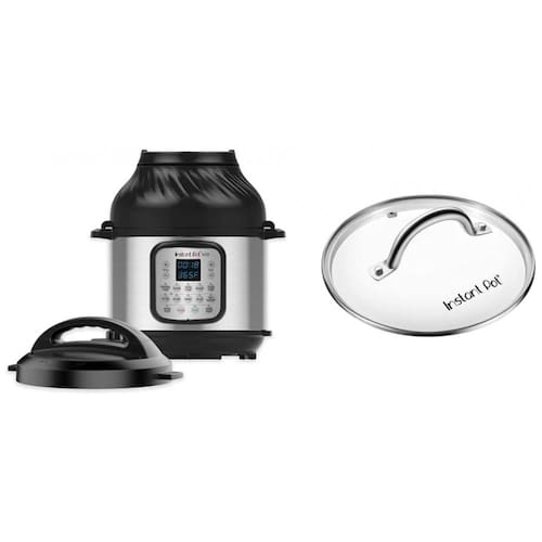 Acompanha uma tampa de vidro temperado Instant Pot com válvula de vapor, borda de aço inoxidável e alça resistente.