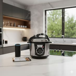 Panela de pressão elétrica com painel digital, capacidade de 4 litros, cuba antiaderente removível, funções pré-programadas, timer com desligamento automático e avisos sonoros, função manter aquecido, corpo em aço escovado com detalhes em metal e plástico, cabo de força removível.Lâmpada piloto
