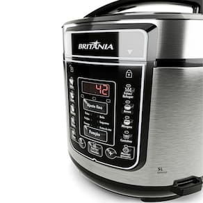 Potência: 900W. Capacidade de 5L. Acabamento em aço inox. Timer com 13 funções pre programadas. Display digital. Alças laterais. Função aquecer, refogar ou cozinhar. Cordão elétrico removível. Pés antiderrapantes. Tigela removível com revestimento Redstone. Tampa com trava de segurança. 9 sistemas de proteção.Lâmpada piloto