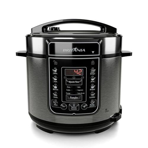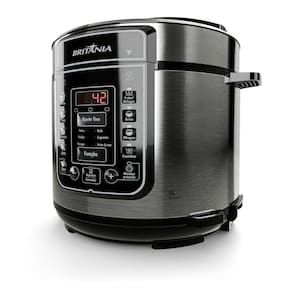 Potência: 900W. Capacidade de 5L. Acabamento em aço inox. Timer com 13 funções pre programadas. Display digital. Alças laterais. Função aquecer, refogar ou cozinhar. Cordão elétrico removível. Pés antiderrapantes. Tigela removível com revestimento Redstone. Tampa com trava de segurança. 9 sistemas de proteção.Lâmpada piloto
