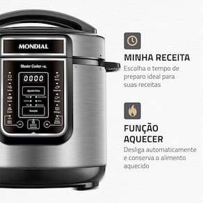 Com a Panela de Pressão Elétrica Digital Master Cooker 6L, você pode preparar diversas receitas, que vão muito além de feijão. Sua versatilidade é um ponto forte: as 14 receitas predefinidas facilitam o preparo de uma variedade de pratos, desde arroz e carnes, até legumes e sobremesas. O painel digital é intuitivo e fácil de ler, descomplicando a operação. Possui acabamento impecável em aço inox para se destacar em sua cozinha. Saiba mais sobre a PE-60-6L-I da Mondial: