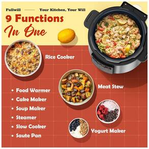 Desfrute de 9 eletrodomésticos em 1 com a Panela de Pressão Fullwill: panela de pressão, panela de cozimento lento, panela de arroz, fabricante de iogurte, fabricante de bolo, frigideira para refogar, cozinha a vapor, aquecedor de comida e preparador de sopas. Com 12 programas pré-definidos personalizáveis, incluindo cozimento rápido, cozimento lento, aves, vapor, mingau, sopa, feijão/chili, bolo, carne/guisado, arroz/grãos, refogar e iogurte, oferecendo máxima versatilidade para diversas necessidades culinárias. Cozinha refeições até 70 mais rápido que os métodos tradicionais, economizando energia e tempo, ideal para estilos de vida agitados. Possui mais de 10 recursos de segurança, proteção contra superaquecimento, trava de segurança de tampa e controle de pressão. O botão SealVent está posicionado longe da válvula de liberação de vapor, e o design de liberação de vapor inclinado para trás garante uma liberação mais segura, sem riscos de queimaduras. Design saudável sem PFOA, com uma panela interna antiaderente livre de produtos químicos nocivos. Fácil de limpar, com estrutura em aço inoxidável resistente a impressões digitais e tampa, panela interna e acessórios próprios para lava-louças, garantindo uma limpeza sem esforço. Com capacidade familiar de 6 litros, perfeita para preparar refeições para famílias ou grandes eventos.