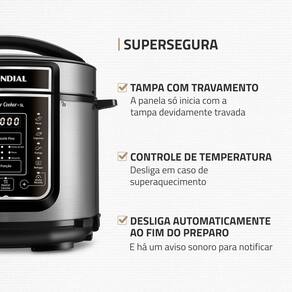 Painel digital com 14 funções pré-programadas, Timer programável em até 24 horas, Função aquecer, Cuba antiaderente e removível, Tampa ergonômica com travamento e alça, Coletor de vapor.Lâmpada piloto