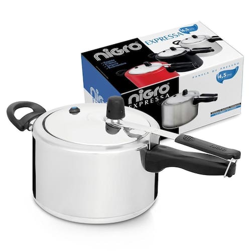 Facilite o seu dia a dia na cozinha preparando suas receitas com esta Panela de Pressão Expressa 4,5 Litros em Alumínio Nigro. Possui válvula reguladora de pressão, válvula de segurança repetitiva válvula com dupla função. Seus cabos e alças são em baquelite trazendo mais resistentes garantindo total segurança no manuseio. Agora você poderá preparar deliciosas receitas com o mais moderno sistema que a Nigro oferece para sua cozinha, e ainda essa panela de pressão possui a tecnologia antiaderente que auxilia no cozimento garantindo que o calor se espalhe de forma mais rápida e uniforme, e ajudando muito na hora da limpeza, uma vez que o antiaderente não deixa o alimento grudar assim ganhando mais tempo na sua cozinha. Veja a sua cozinha ficar muito mais prática e moderna com essa panela de pressão e veja como preparar suas receitas pode ser muito mais prazeroso e prático! A qualidade, a responsabilidade e o respeito pelos consumidores são os mais fortes valores agregados à marca Nigro.Código de barras:7891232971946Referência:97194Marca: NigroComposição/Material:AlumínioDimensões aproximadas da embalagem (cm):18,2x45x22,8 cmPeso aproximado da embalagem do produto (kg):1.018 kg