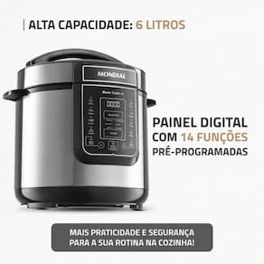 A Panela de Pressao Digital Mondial PE60 e uma opcao pratica e eficiente para quem busca agilidade e conforto na cozinha. Com uma capacidade de 6 litros, ela atende bem a familias de tamanho medio e e ideal para preparar refeicoes para varias pessoas de uma vez. Seu design moderno e compacto facilita o armazenamento, enquanto o painel digital torna a operacao mais simples e intuitiva.