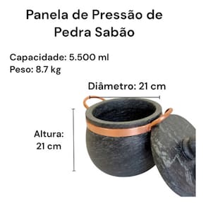 - 01 Panela de Pressão de Pedra Sabão com capacidade de 5.5 litros (5.500 ml) - Diâmetro da boca: 21 cm - Altura: 21 cm - Peso: 8,7 kg