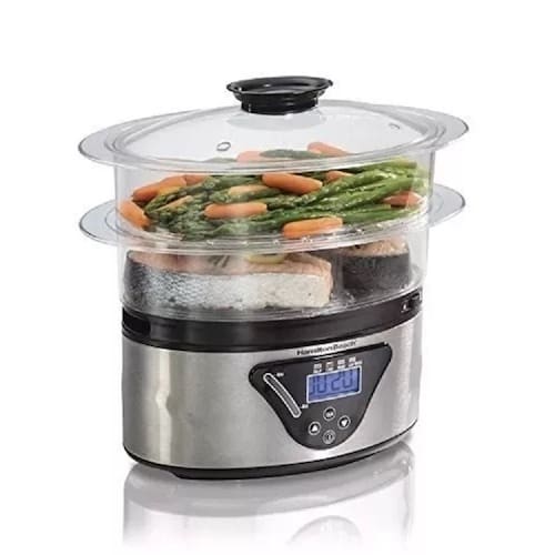 Versátil, empilhável de 2 camadas de vapor, armazenamento alinhado - se encaixa perfeitamente no gabineteUse 1 camada para pequenas quantidades, empilhe 2 camadas para uma refeição inteira ou remova o divisor central para acomodar uma variedade de alimentos grandesQuente automático - muda para aquecer quando a comida está prontaTouchpad digital - torna a configuração do temporizador de contagem decrescente e outras funções fáceisOs recipientes de alimentos devem ser lavado à mão em água com sabão, para não limpar na máquina de lavar louça. Somente a bandeja de gotejamento e a tigela de arroz são laváveis na máquina de lavar louça.