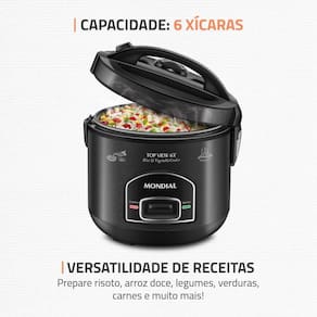 NãoA Panela Elétrica Top View 6X Mondial prepara até 6 xícaras com praticidade. A tampa com visor transparente permite ver o cozimento em tempo real e ainda valoriza o design com um acabamento moderno. Versátil, faz diferentes tipos de arroz e ainda permite criar receitas com legumes, verduras e carnes. A cuba antiaderente removível facilita a limpeza, enquanto a função aquecer mantém o arroz quentinho por horas. Com 1 ano de garantia Mondial, é uma escolha segura e eficiente para a rotina na cozinha. Saiba mais sobre a PE-30-6X da Mondial: