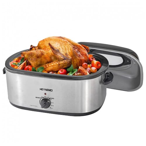 Grande capacidade de 22 litros, tampa alta acomoda peru. Tampa auto reguente para alimentos mais saborosos. Rack de elevação incluído para alimentos grandes. Temperatura ajustável multifuncional e manter a função quente, você pode assar, assar, cozinhar lentamente e servir. Poderoso 1450W AC120V, torrador de aço inoxidável, pés antiderrapantes e alça de toque frio para segurança ao usar. Pote e tampa removíveis, fáceis de limpar e laváveis, controle de temperatura em toda a gama.Lâmpada piloto