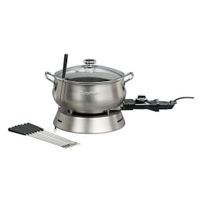 Panela elétrica para fondue em aço inox escovado com tampa de vidro temperado. Possui revestimento interno antiaderente, termostato com 8 níveis de ajuste de temperatura (44°C a 180°C) e sistema de aquecimento encapsulado para distribuição uniforme de calor. Inclui 8 garfos com identificadores coloridos e aro de suporte.Porta fio