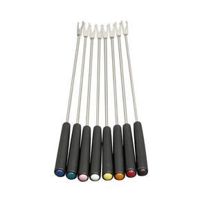 Panela elétrica para fondue em aço inox escovado com 8 níveis de controle de temperatura (44°C a 180°C). Possui revestimento interno antiaderente, tampa de vidro temperado, sistema de aquecimento encapsulado e capacidade de 2,84 litros. Inclui 8 garfos com identificadores coloridos e aro de suporte.Porta fio