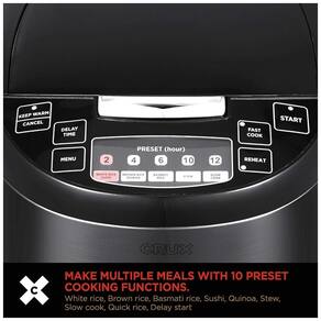 Sistema de aquecimento de 600 watts | Prepara até 2,8 kg de arroz cozido em 30 minutos | 10 funções de cozimento predefinidas | Tela LED de fácil leitura | Sinal sonoro | Mantém o arroz aquecido por até 12 horas | Panela removível com revestimento antiaderente | Tampa articulada | Acorde de energia destacávelLâmpada piloto