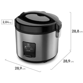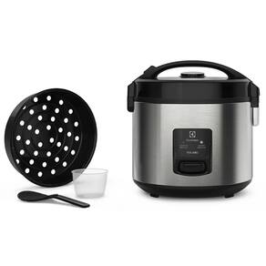 Panela de arroz elétrica Electrolux com capacidade de 3 litros (10 xícaras), potência de 700W, função 2 em 1 (cozimento a vapor), função manter aquecido, coletor de vapor, desligamento automático, panela antiaderente removível, luz indicadora de funcionamento e design em aço inox.Lâmpada piloto