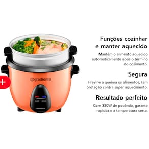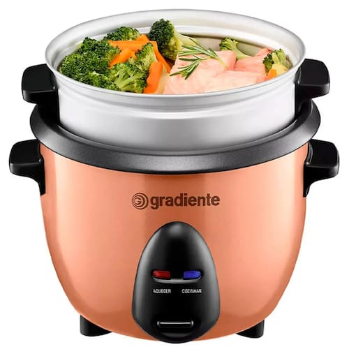Conheça a incrível Panela Multiuso da Gradiente, uma verdadeira 3X1 na sua cozinha: uma solução versátil e elegante para simplificar sua cozinha e promover refeições rápidas e saudáveis. Esta panela multiuso é sua aliada na cozinha, combinando três funções essenciais em um único aparelho: Risoteira: Prepare risotos deliciosos e cremosos com facilidade. A panela mantém a temperatura ideal para um resultado perfeito. Panela de Arroz: Cozinhe arroz com rapidez e precisão. Com uma capacidade de 600ml, você pode fazer até três copos de arroz, tornando-se ideal para refeições em família ou com amigos. Vaporeira: Cozinhe no vapor para manter os nutrientes dos alimentos e garantir uma alimentação saudável. A alça da vaporeira é projetada para não esquentar, garantindo sua segurança durante o uso. Fabricada em aço inoxidável escovado com uma bela pintura na cor cobre, a panela multiuso é um complemento sofisticado para a sua cozinha. Segurança Garantida: A panela multiuso possui desligamento automático por superaquecimento, proporcionando tranquilidade enquanto cozinha. Potência Eficiente: Com 350W de potência, a panela multiuso é eficaz e econômica em termos de energia.