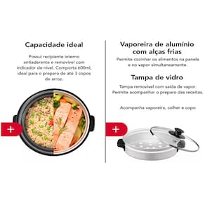Ficha Técnica: Potência: 350W Manual Completo em Português Corpo em Aço Inox Escovado com Pintura na cor Cobre. Tipo de produto: Panela Funções: Cozinhar, risoteira, vaporeira Capacidade de canecas: 3 Capacidade em volume: 600mL Material da tampa: Vidro Sistema de cozedura: A vapor Com desligamento automático: Sim Com função manter aquecido: Sim Acessórios incluídos: Colher plástica, Copo medidor Com revestimento antiaderente: Sim Materiais: Aço inoxidável Cor: Gold/Cobre