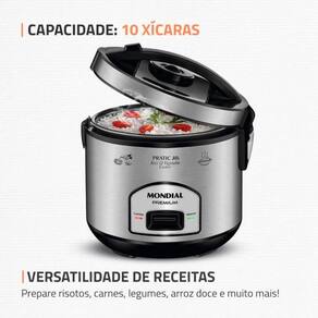 Com a Panela Elétrica Pratic 10i Premium Mondial você ganha tempo e eficiência no preparo das suas refeições. Possui capacidade para preparar até 10 xícaras de arroz e acompanha cesto que cozinha alimentos no vapor, preservando todos os nutrientes. Possui função aquecer, que mantém suas receitas quentinhas mesmo após terminar o preparo. Além disso, o design em inox garante sofisticação para sua cozinha.