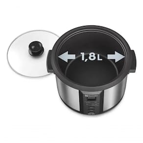 Sua panela Electrolux ainda conta com tampa de vidro temperado, exterior em aço inoxidável escovado, suporte para cozimento a vapor, recipiente interno removível antiaderente e cabo elétrico removível.EspecificaçõesCapacidade em litrosDe 1,4L a 1,8LCapacidade de xícarasDe 8 a 10 XícarasDesligamento automáticoSimPainel digitalSimSuporte de cozimento à vaporSimTampa de vidroSimTampaAbertaCabo de energia removívelSimPotência630 WTimerSimCorPreto / InoxFunção manter aquecidoSimTipo de painelDigitalEspecificações técnicasModeloECC20Frequência60 HzAltura do produto24,3 cmLargura do produto