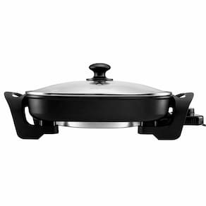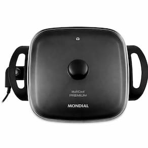 Panela elétrica que cozinha, grelha, assa e aquece. Revestimento antiaderente liso. Tampa em vidro temperado com válvula de saída de vapor. Alças anatômicas e isotérmicas. Lâmpada piloto indica funcionamento. Cabo elétrico de 150cm.Lâmpada piloto