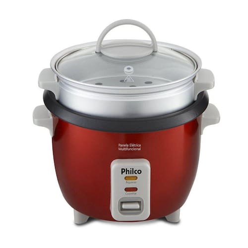 A Panela Elétrica Multifuncional Philco prepara diversas receitas salgadas e doces, arroz, sopas, caldos, carnes, legumes. Acompanha tigela com revestimento antiaderente e bandeja em alumínio com alças para cozimento no vapor. Características: - Função aquecimento: Mantém o alimento aquecido após o preparo. - Tampa de vidro: Possibilita acompanhar o alimento durante o preparo. - Capacidade para 3 xícaras de arroz - Prepara diversos tipos de alimentos - Mantém os alimentos aquecidos após o preparo - Acompanha colher e copo medidor - Painel com luzes que indicam modo cozimento e aquecimento - Tampa de vidro temperado com saída de vapor - Tigela removível e com revestimento antiaderente, fácil de limpar - Capacidade total da tigela: 1,7L - Bandeja para cozimento no vapor em alumínio e com alças laterais - Composição: metal e plástico, tigela e bandeja de cozimento a vapor em alumínio; tampa de vidro