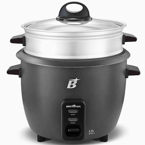 Cozinha até 7 xícaras de arroz, 500W de potência, tampa com válvula de saída de vapor, revestimento antiaderente, função manter aquecido, copo medidor e colher dosadora inclusos, luz indicadora de funcionamento, base antiderrapante, coletor de vapor removível.Lâmpada piloto