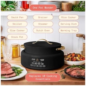 Panela elétrica multiuso 10 em 1 da linha Beautiful by Drew Barrymore com capacidade de 5,7 litros, acabamento Porcini Taupe e painel digital com comandos por toque para preparo de diferentes tipos de receitas em um único equipamento. O aparelho combina funções de panela de pressão, panela lenta, sauté, cozimento de arroz, vapor e outros modos, permitindo ajustar tempo e temperatura conforme o tipo de preparo.
