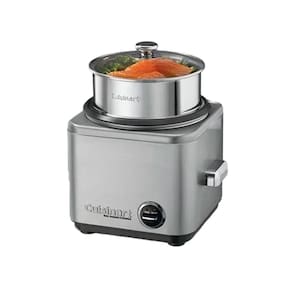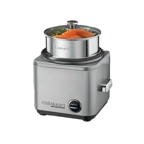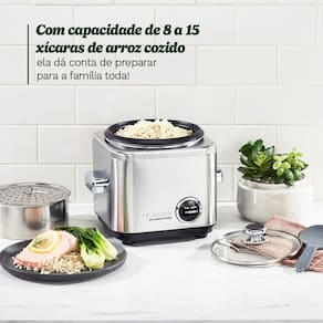 Panela elétrica para arroz com cesto de vapor em aço inox, gabinete em aço inox escovado, tampa de vidro temperado e revestimento interno antiaderente. Função Manter Aquecido. Alças frias ao toque e saída de vapor controlada.Lâmpada piloto