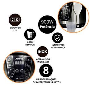 Prepare refeições deliciosas e práticas com a panela elétrica Amvox APS 050. Capacidade de 5 litros, 900W de potência, acabamento em inox e sistema de proteção garantem eficiência, segurança e versatilidade para sua cozinha. Com acabamento em inox e capacidade de 5 litros, a panela elétrica Amvox APS 050 une eficiência e segurança. Com potência de 900W, display digital e revestimento antiaderente, ela é ideal para preparar refeições práticas e saudáveis. Conta com um sistema avançado de controle de pressão e temperatura para garantir tranquilidade e praticidade.