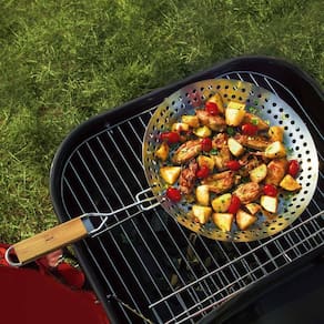 Cabo removível permite revirar os alimentos para serem grelhados por igual. Maravilhosa para fazer camarões grelhados com legumes, mix de frutos do mar, etc.