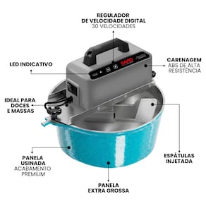 Regulador de velocidade digital com até 30 níveis, motor de 130W com tecnologia RED-Plus, fundo triplo e paredes extra grossas para melhor distribuição de calor, espátulas de silicone resistentes ao calor, temporizador digital, suporte para virar doces ou massas, certificada pelo INMETRO.Lâmpada piloto