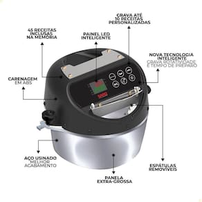 - Com capacidade de 4L, inox resistente e painel digital, ela mistura e cozinha automaticamente, sem que você precise mexer.