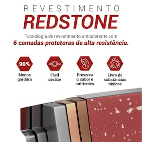 Equipada com Revestimento Redstone proporciona uma resistência maior, pois a panela contém 6 camadas protetoras junto com a tecnologia antiaderente. Dessa maneira, o alimento desliza com facilidade, sem a necessidade de utilizar óleo, o que também permite uma limpeza rápida e descomplicada do produto.